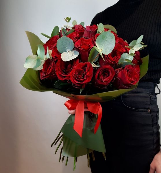 Высота розы составляет 40 см, поэтому букет удобно держать в руках! Красные розы прекрасно дополняет ароматный эвкалипт, который придает букету особый шарм. За счет стильного сочетания цветов, букет отлично вписывается в интерьер, а благодаря своим размерам совсем неприхотлив в уходе и не требует огромных ваз!