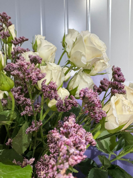 Букет из белых кустовых роз "Сноу Блоссомс" с розовым лимониумом