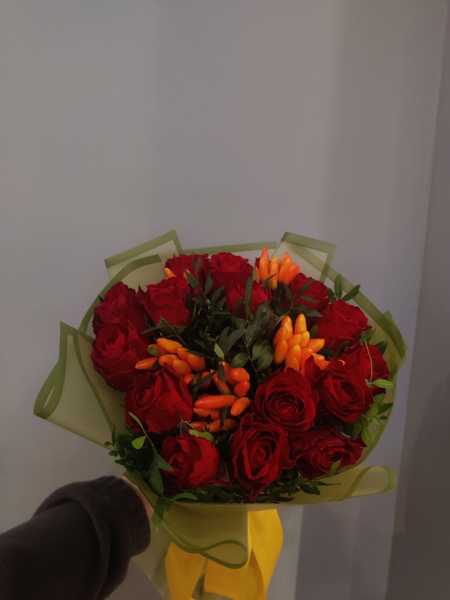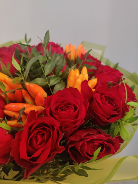 Букет роз Мадам Ред с фисташкой и капсикумом