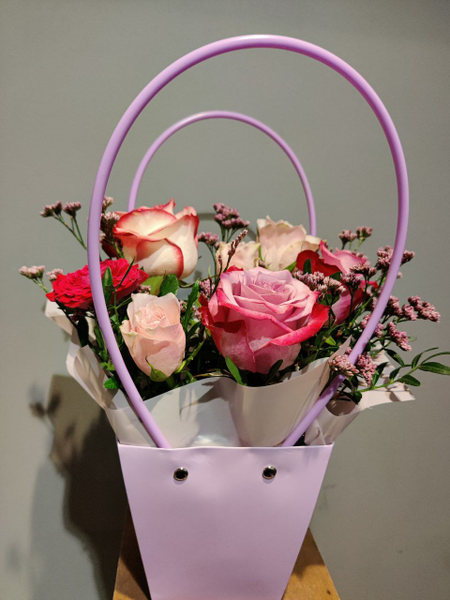 Композиция в сиреневой сумочке с розами