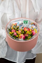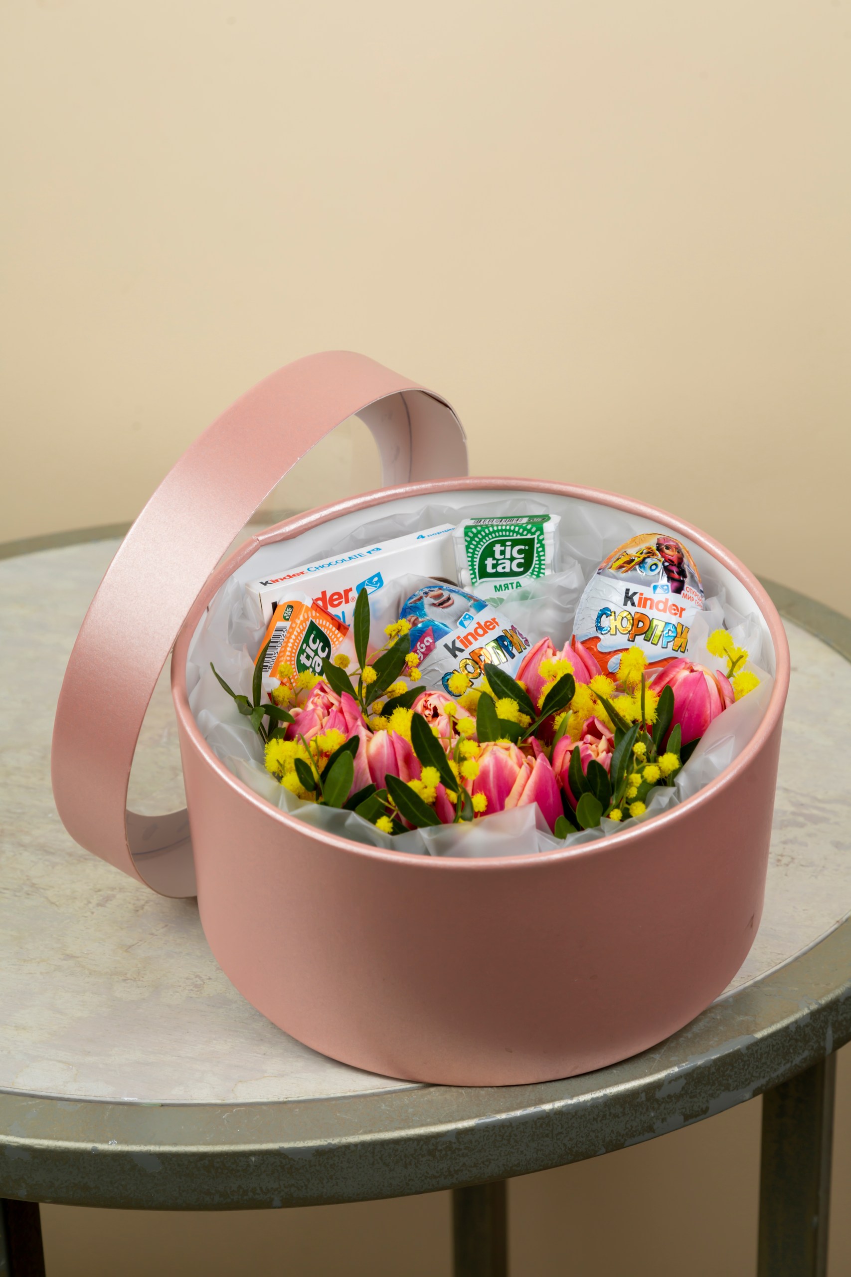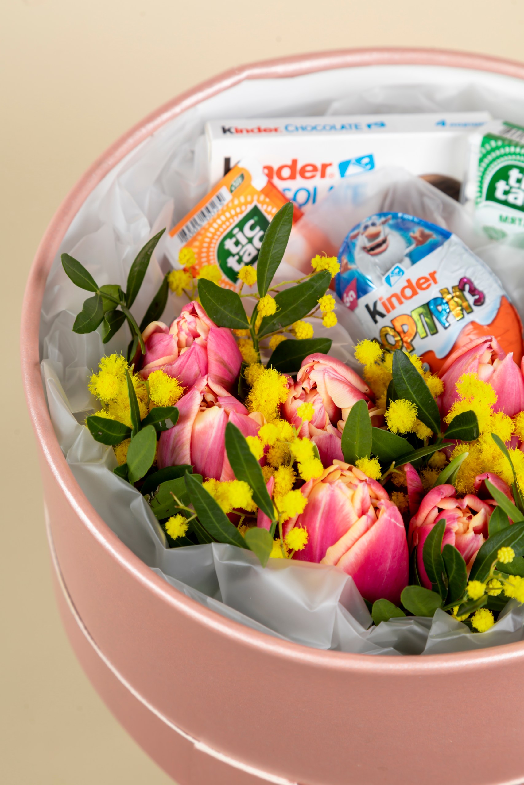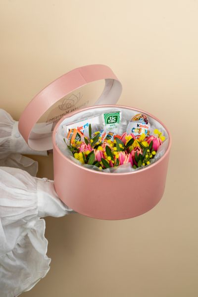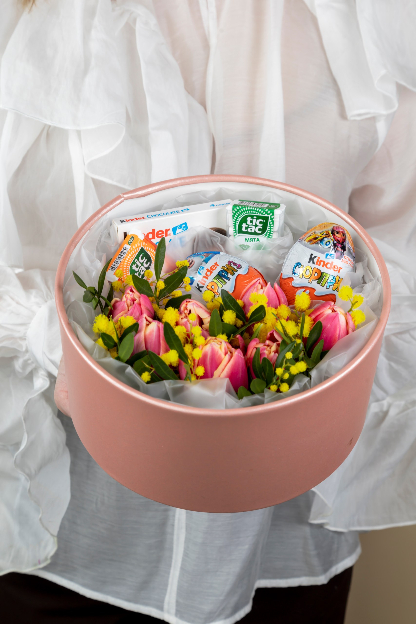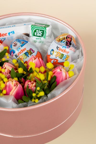 Погрузитесь в мир сладких грёз вместе с нашей уникальной композицией! Настоящее волшебство из свежих цветов и нежных конфет «Kinder» подарит радость, создаст атмосферу тепла и уюта. Идеальный подарок для любимых людей или сюрприз себе любимой – наслаждайтесь каждым моментом, проведенным среди такой красоты и сладости.