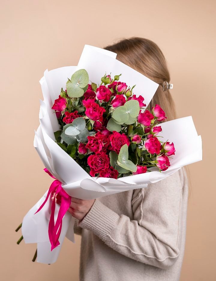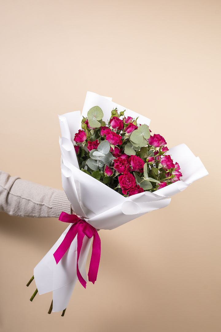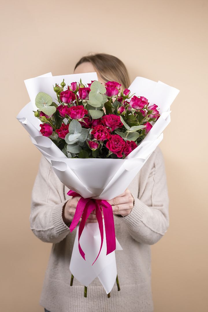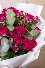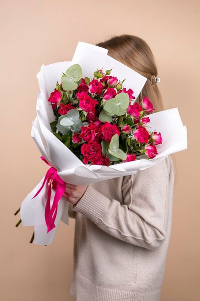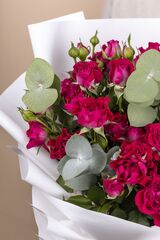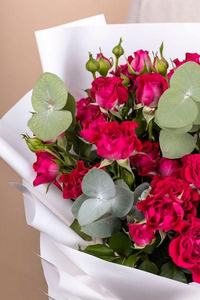 Нежные лепестки малиновой кустовой розы дополненные ароматным эвкалиптом - это воплощение романтики и изысканности! Такой букет подчеркнет Вашу заботу и внимание, став символом искренних чувств и элегантности. Подарите близким букет, который говорит о Ваших чувствах лучше слов. Букет из яркой кустовой розы с эвкалиптом подарит эмоции, которые останутся с Вам надолго!