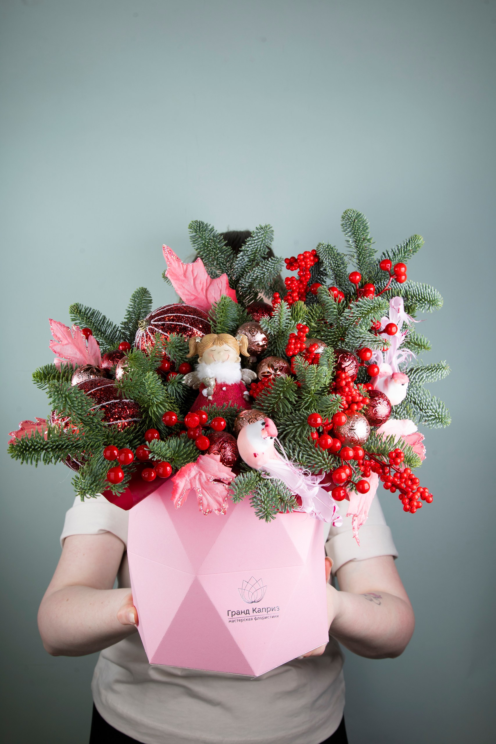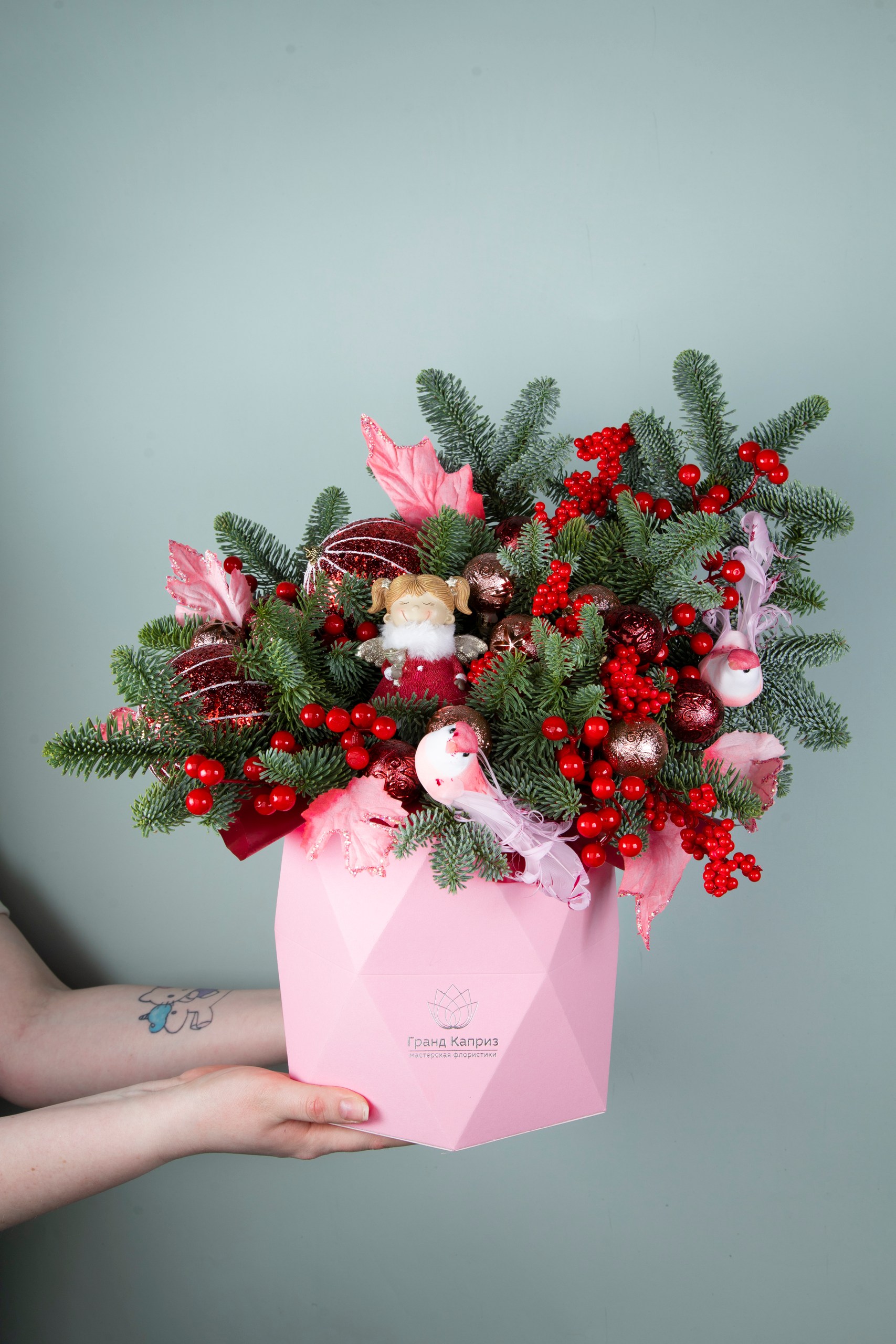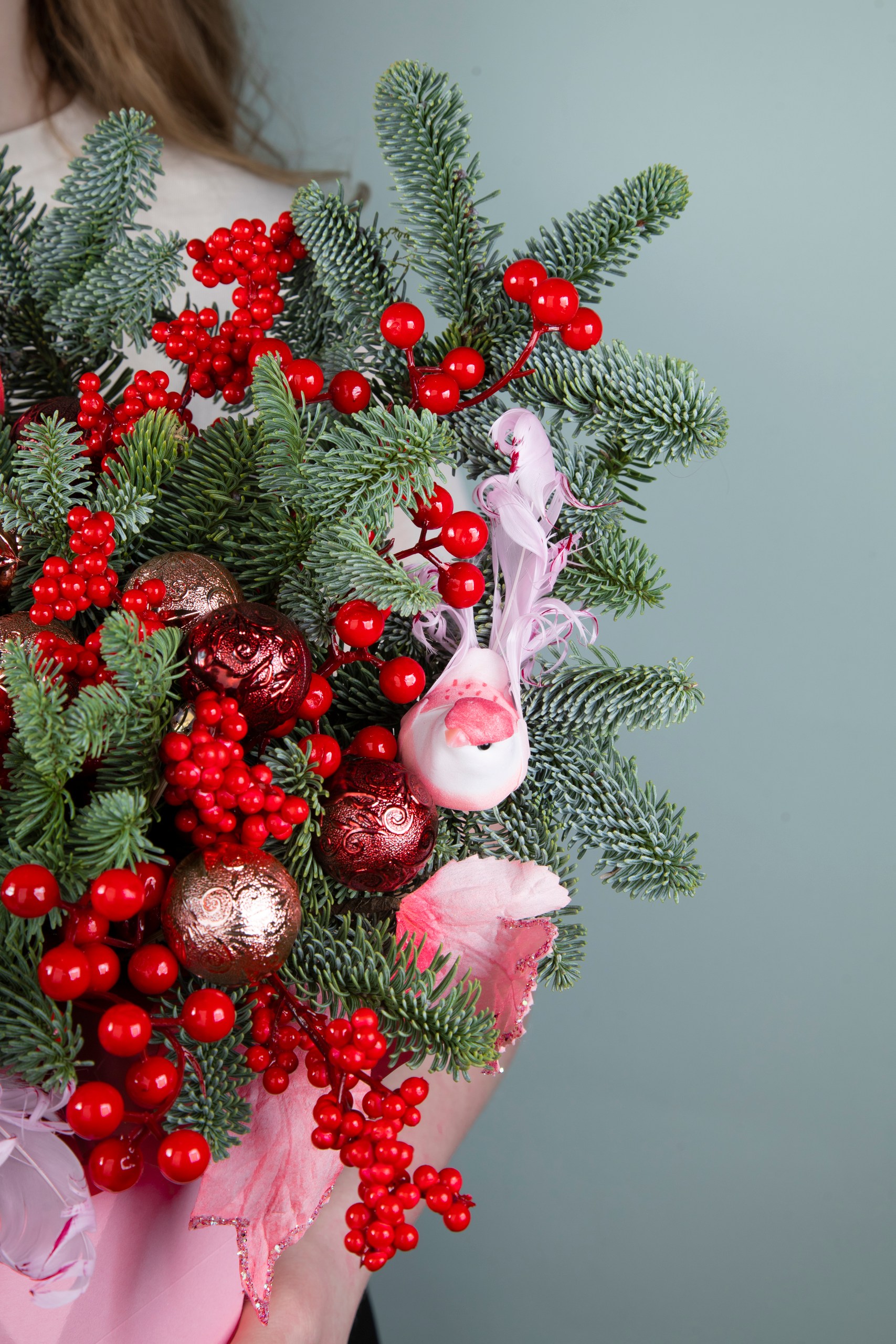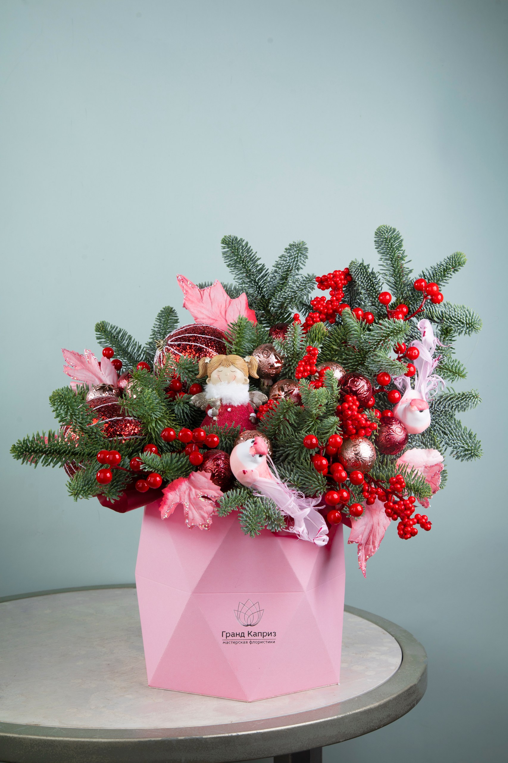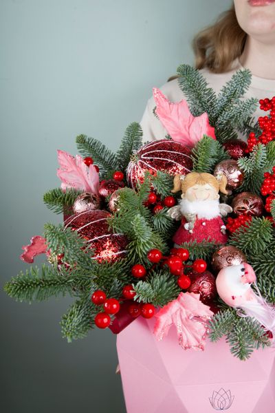 «Розовая сказка» — волшебная композиция из нежных еловых ветвей и ярких красных ягодок! Идеально подчеркнет праздничное настроение вашего интерьера, добавит тепла и красоты вашему дому. Подарите себе и близким немного зимней сказки уже сегодня!