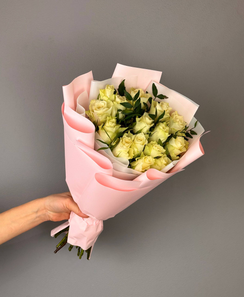 Букет из 15 белых роз с добавлением веточек фисташки