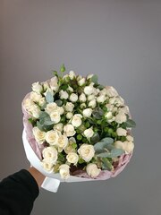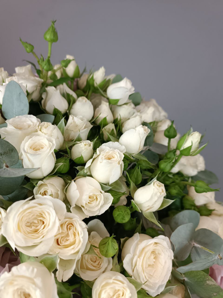 Букет из белой кустовой розы с эвкалиптом