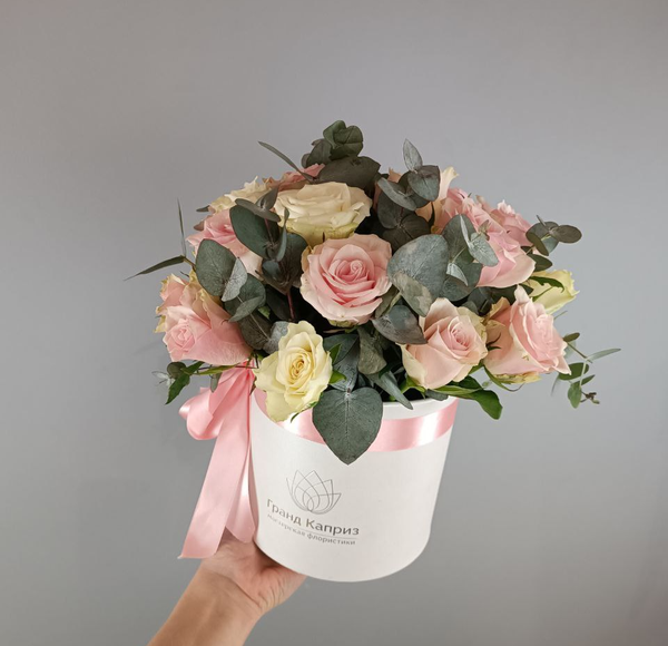 Композиция из роз "Атена" и "Пинк Атена" с эвкалиптом