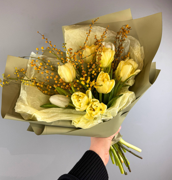 Весенний букет из тюльпанов и мимозы