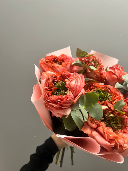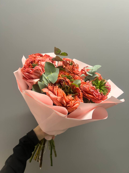 Букет из роз "Мандарин Экспрешн" с эвкалиптом (7 шт)