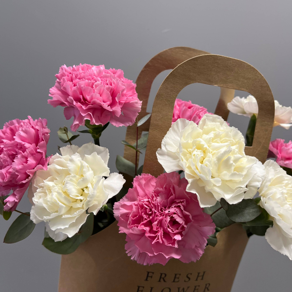 Очаровательная композиция из диантусов с эвкалиптом