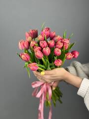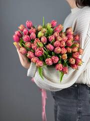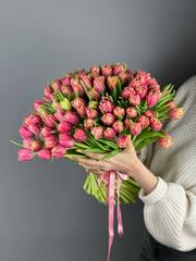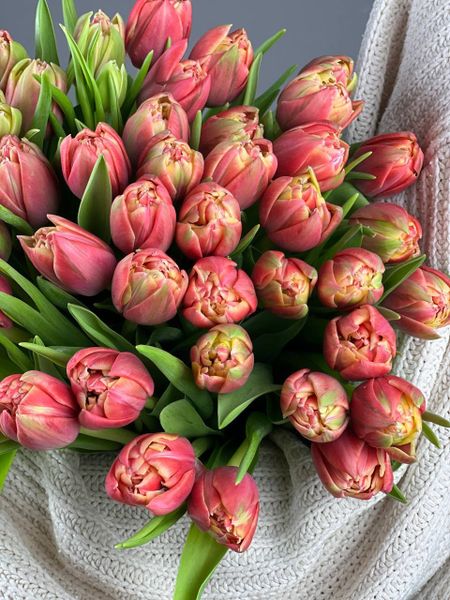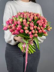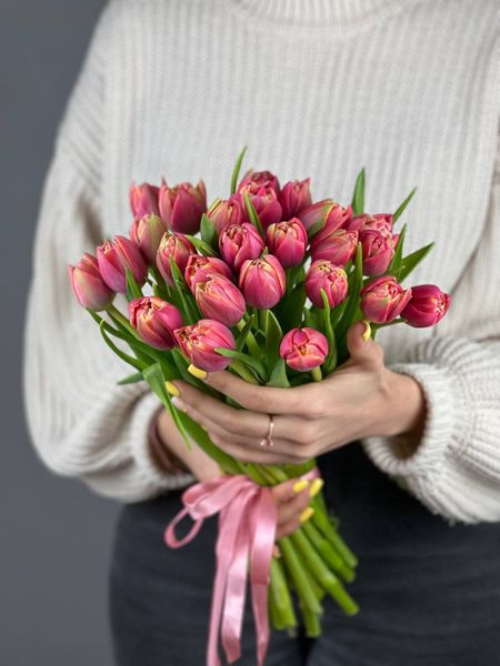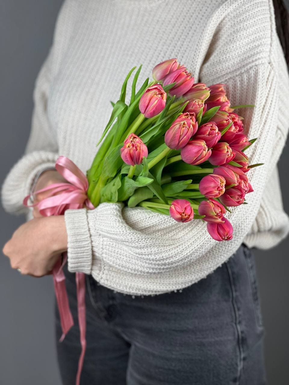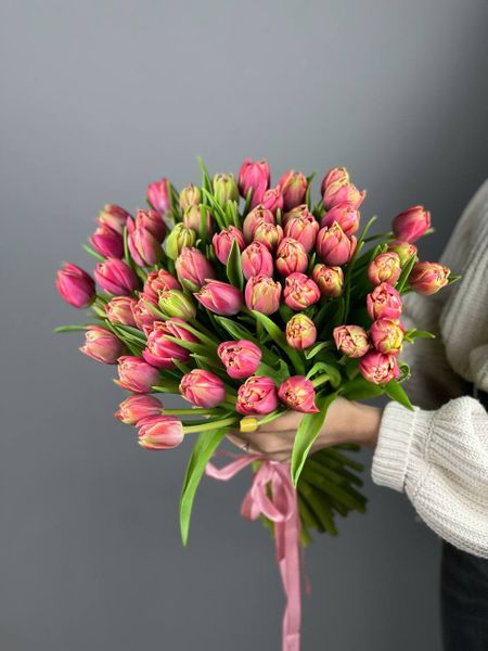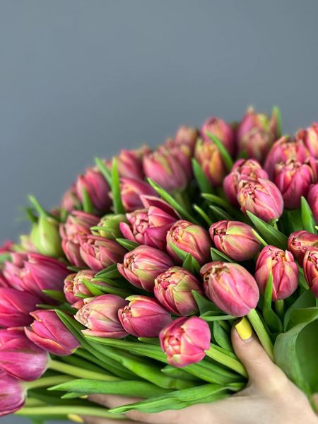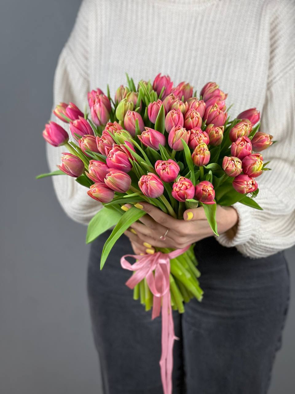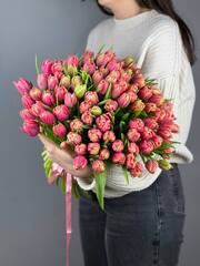 Букет из пионовидных тюльпанов сорта «Колумбус» – это воплощение нежности и красоты! Лепестки у них бывают от ярко-малинового до нежно-розового оттенка с золотистой каймой. В центре бутона часто можно увидеть зеленоватые прожилки. Пионовидные тюльпаны отличаются большим количеством лепестков, что придает им особый шарм!Такой букет будет долго радовать своей красотой и свежестью! Он подойдет для подарка на день рождения, юбилей, свадьбу или 8 марта, подарив весеннее настроение и радость получателю!