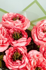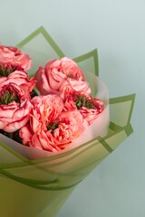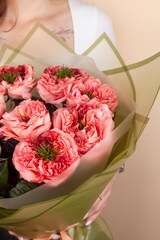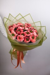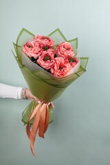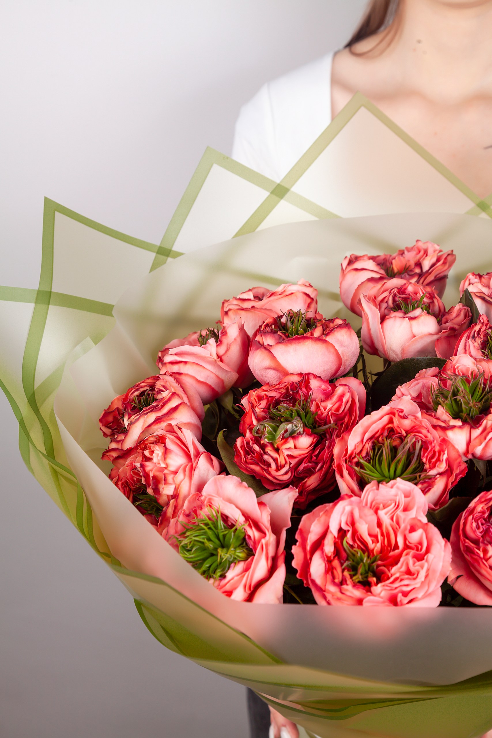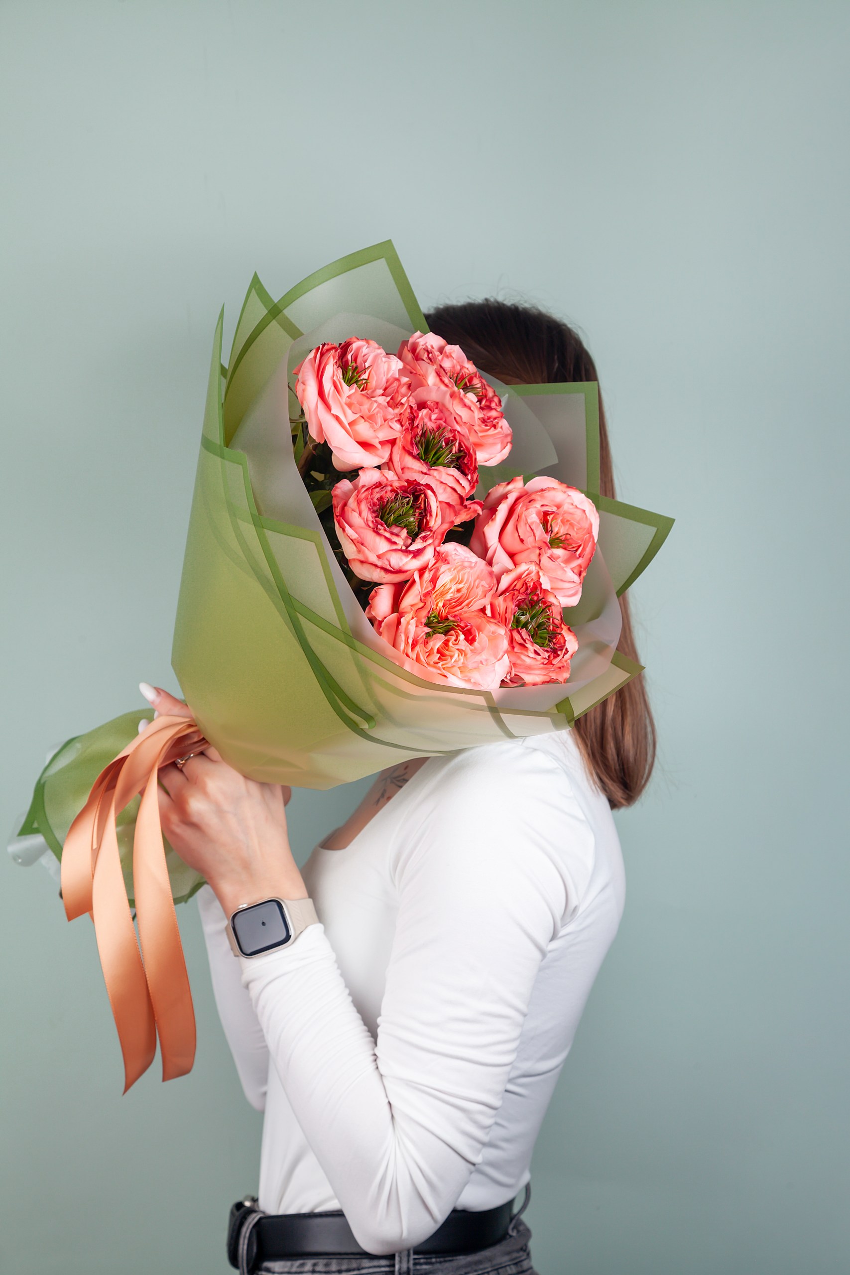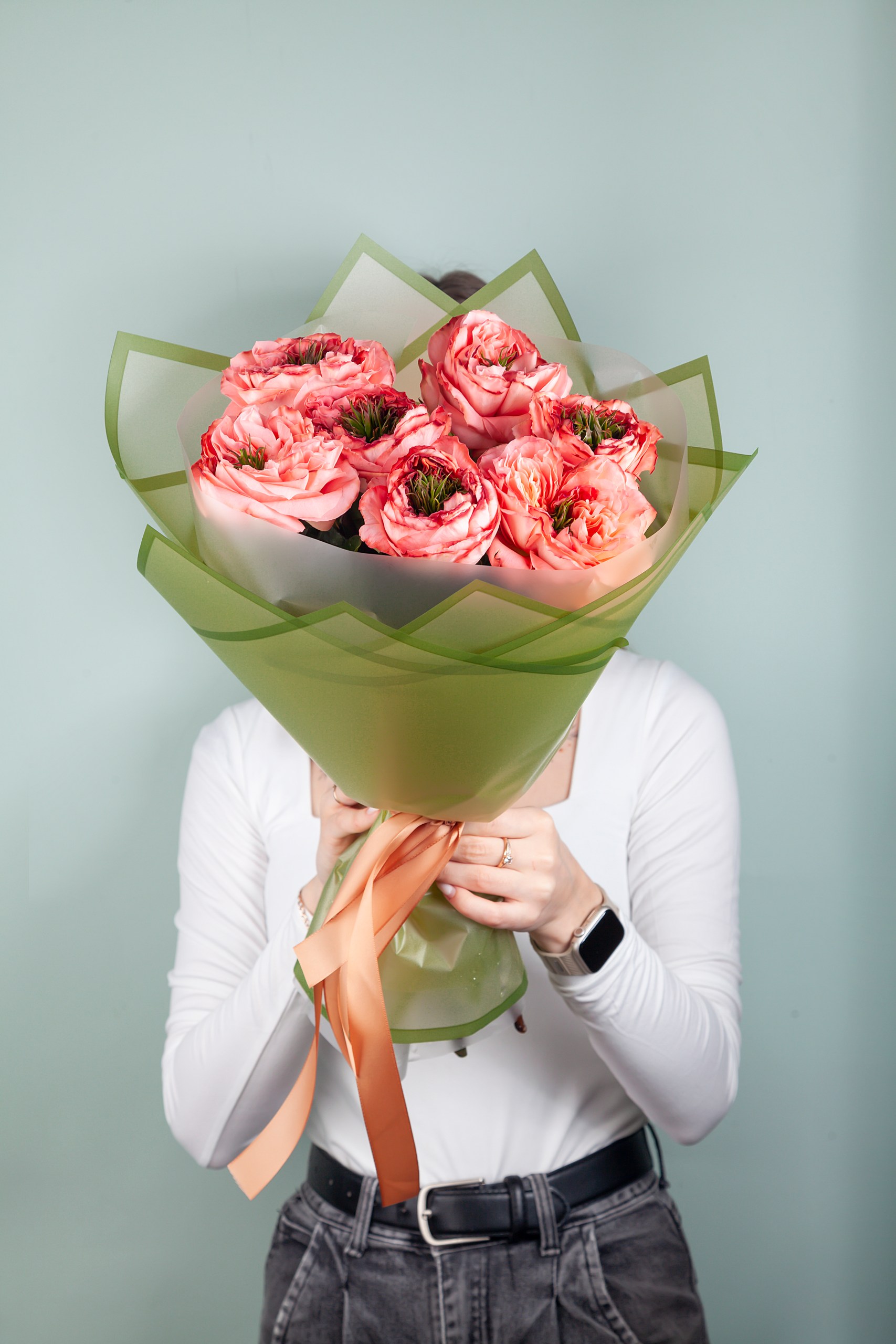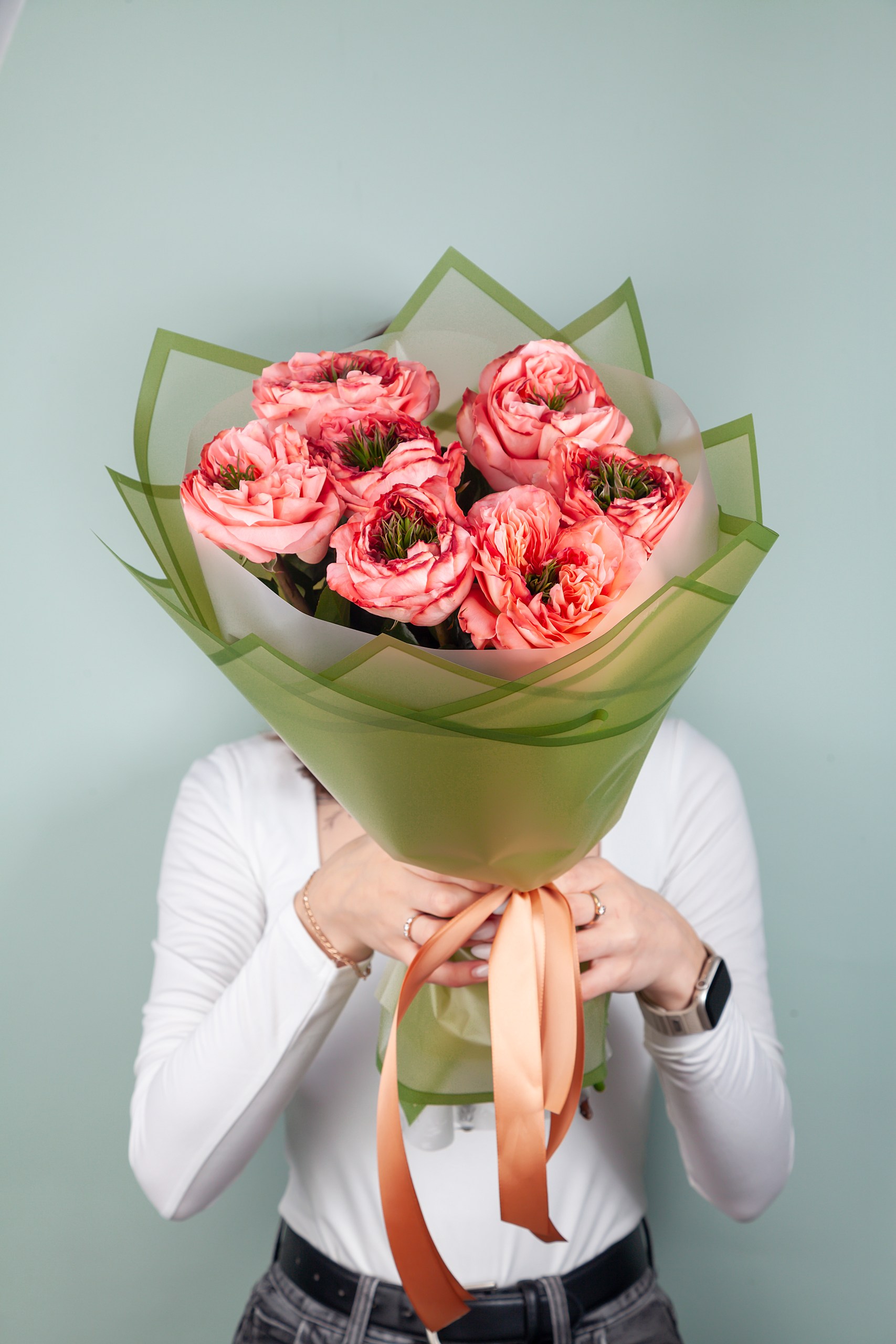 Букет из роз Мандарин Экспрешн объемный за счет использования фисташки в качестве стаффажа.