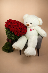 Уникальное комбо «Медведь 120 см + 101 роза Эксплорер 110 см» — идеальный подарок, который подарит радость и восхищение вашим близким! Огромный плюшевый медведь станет верным другом и стильным украшением интерьера, а роскошный букет из 101 розы подчеркнёт вашу заботу и любовь. Эффектное сочетание мягкости и элегантности, которое создаст атмосферу тепла и уюта.